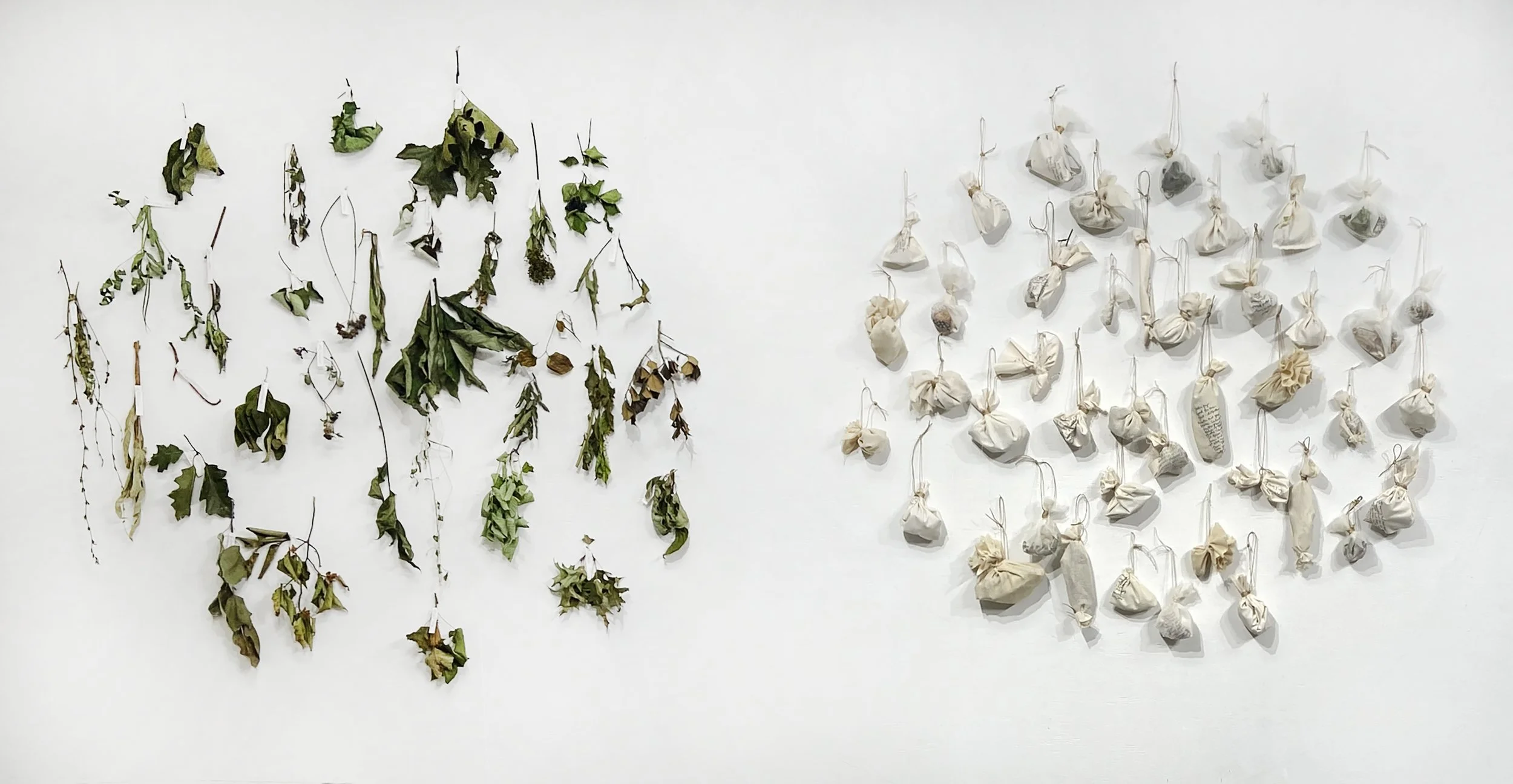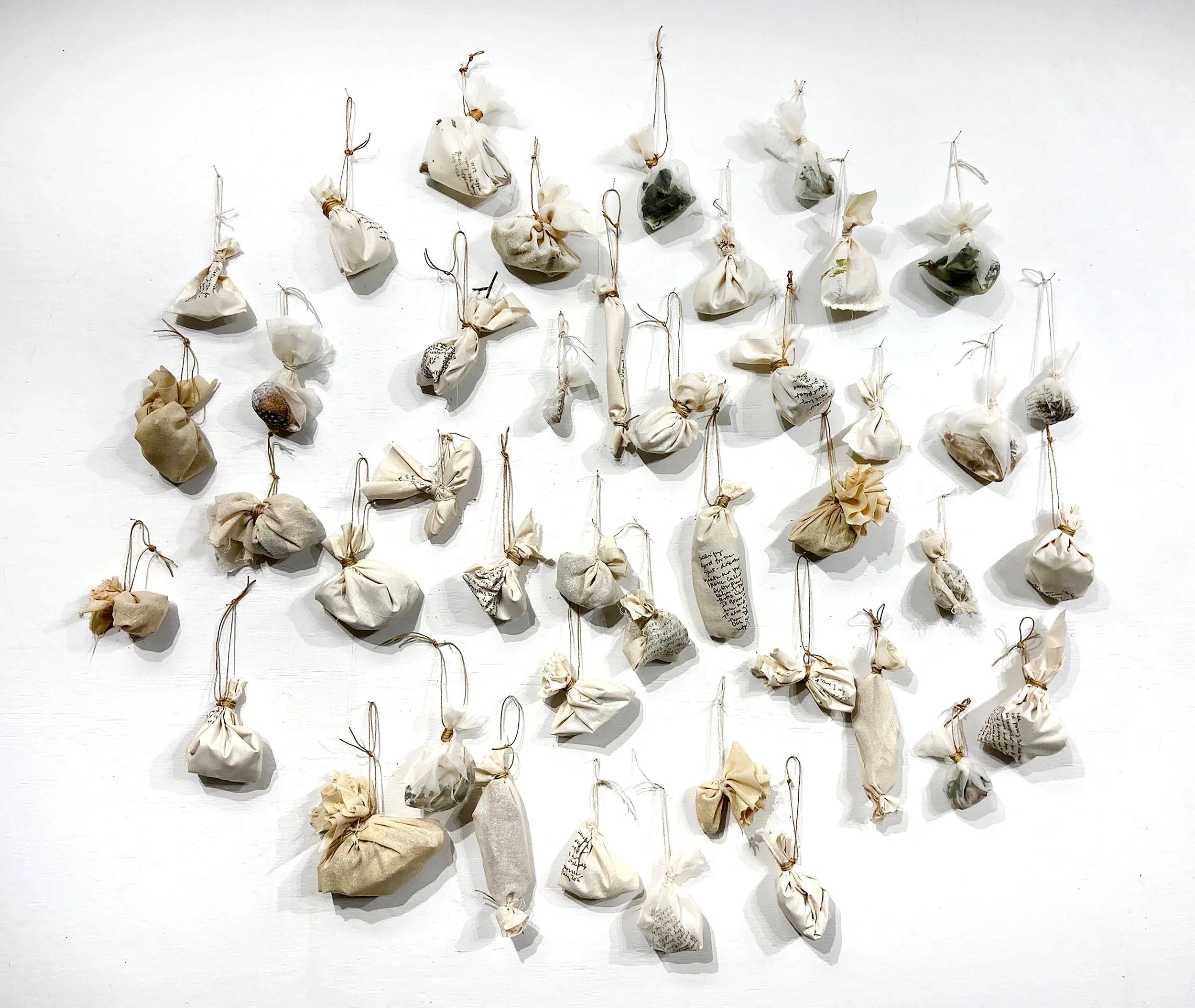 For Gris-gris, plants and found objects were placed in pouches and hung on the wall in a circle. The text on several of the pouches features medicinal plant usages. Gris-gris is a unique artist’s book.