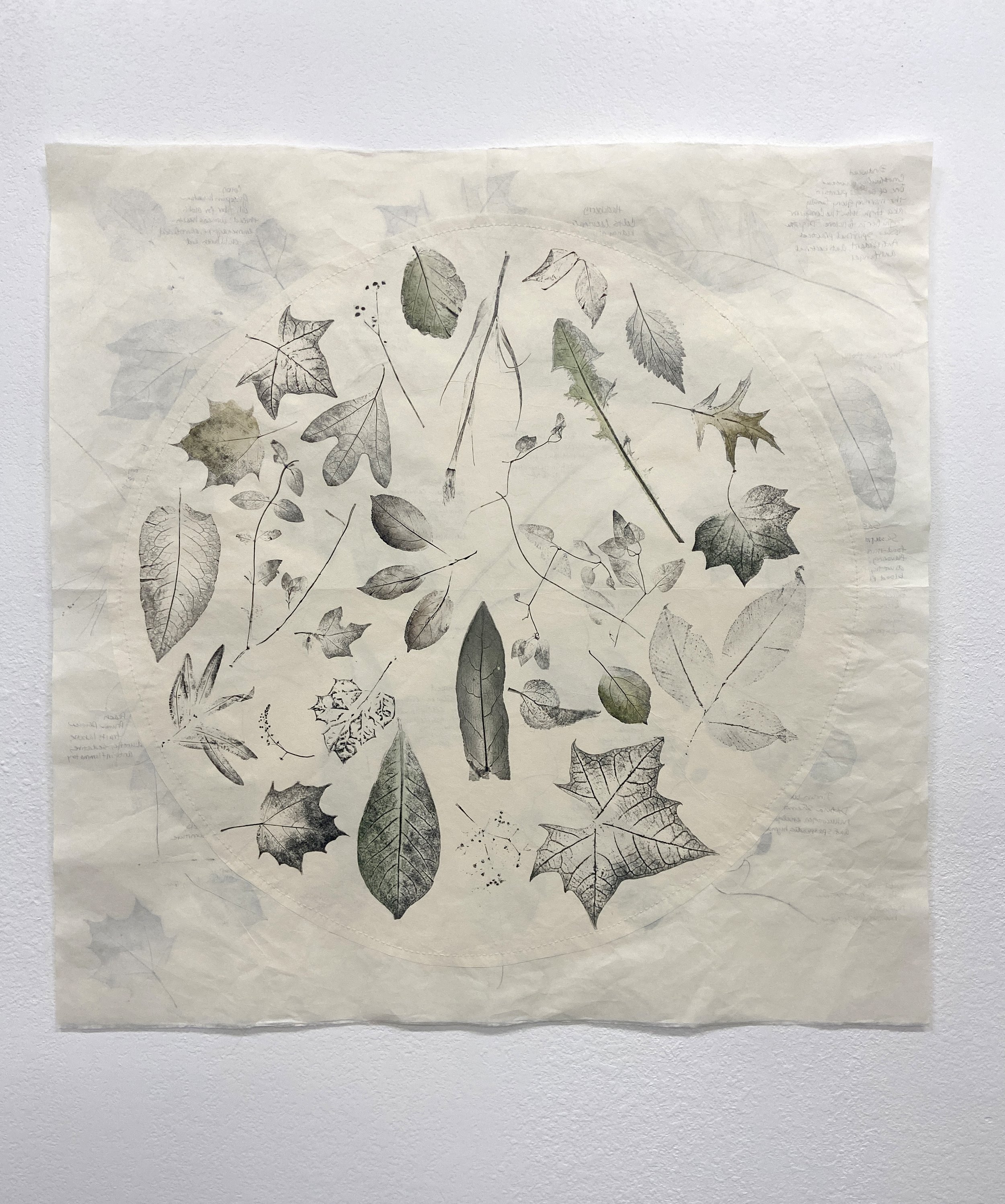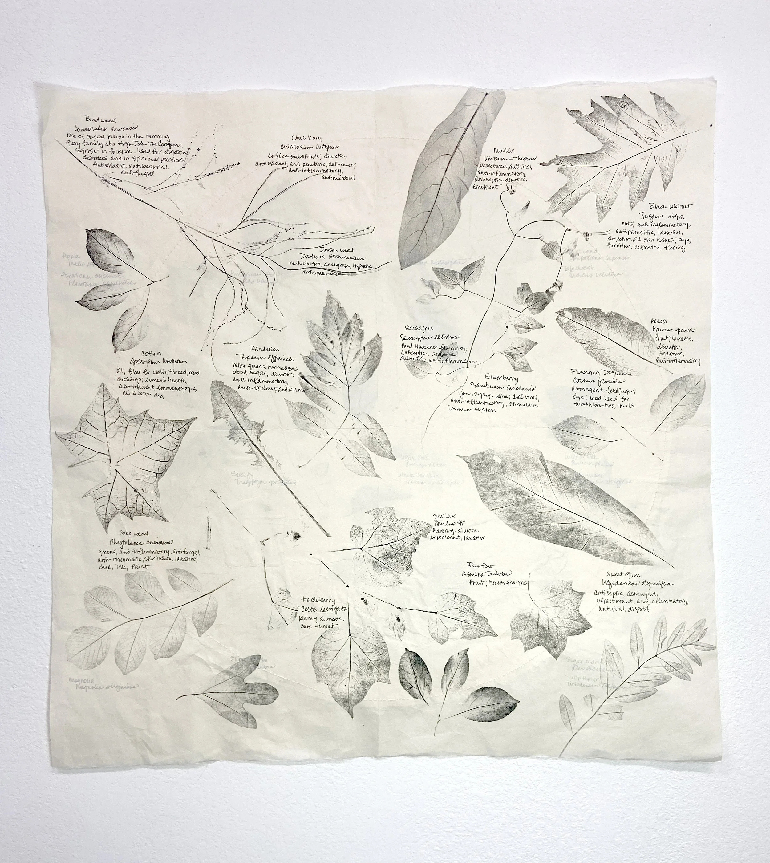 The original (or prototype) version of A Gathering consisted of fresh plants with their names hung in a circle on the studio wall. The plants became withered and twisted, and were discarded upon leaving OSGF, but samples were pressed and later used to make prints for one edition, which also features names and usages of the plants that were gathered. A Gathering is a double-sided one sheet book – one side can be unfolded and read – that can be suspended and viewed from both sides. A Gathering is an edition of three.