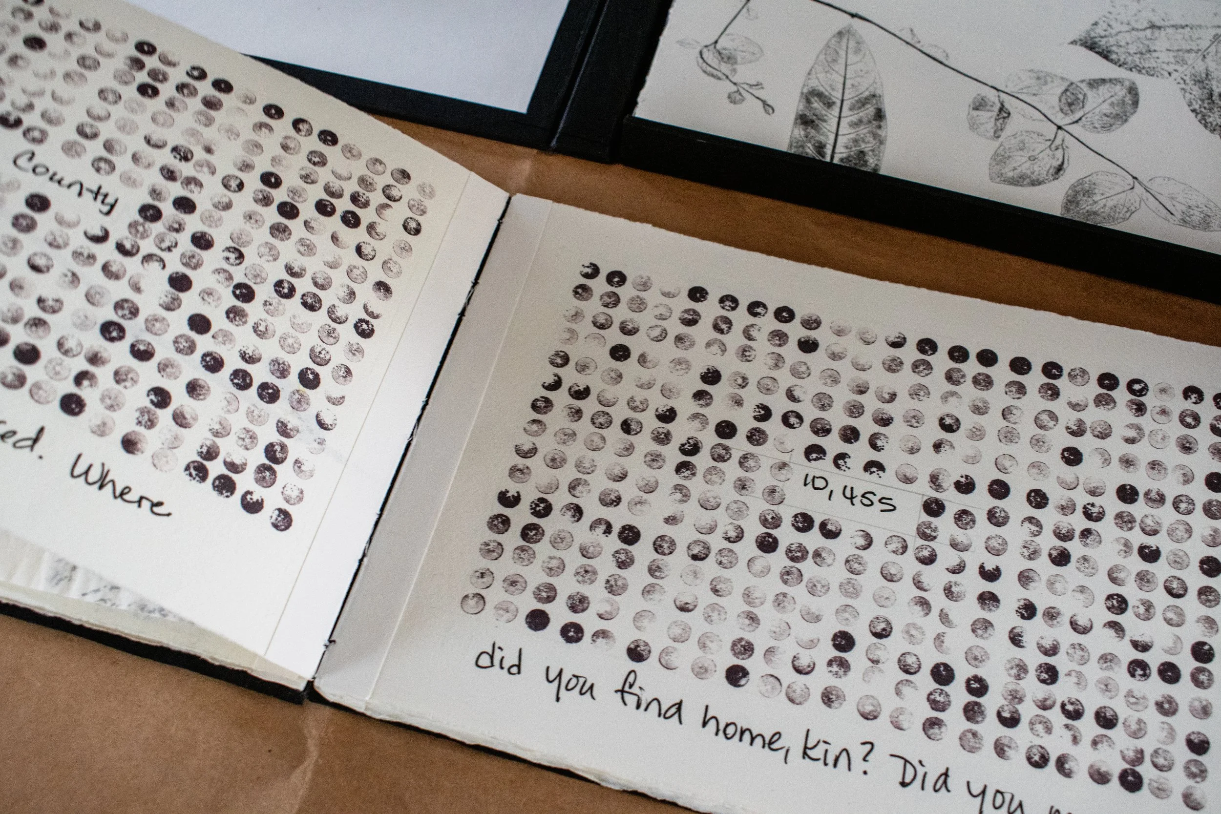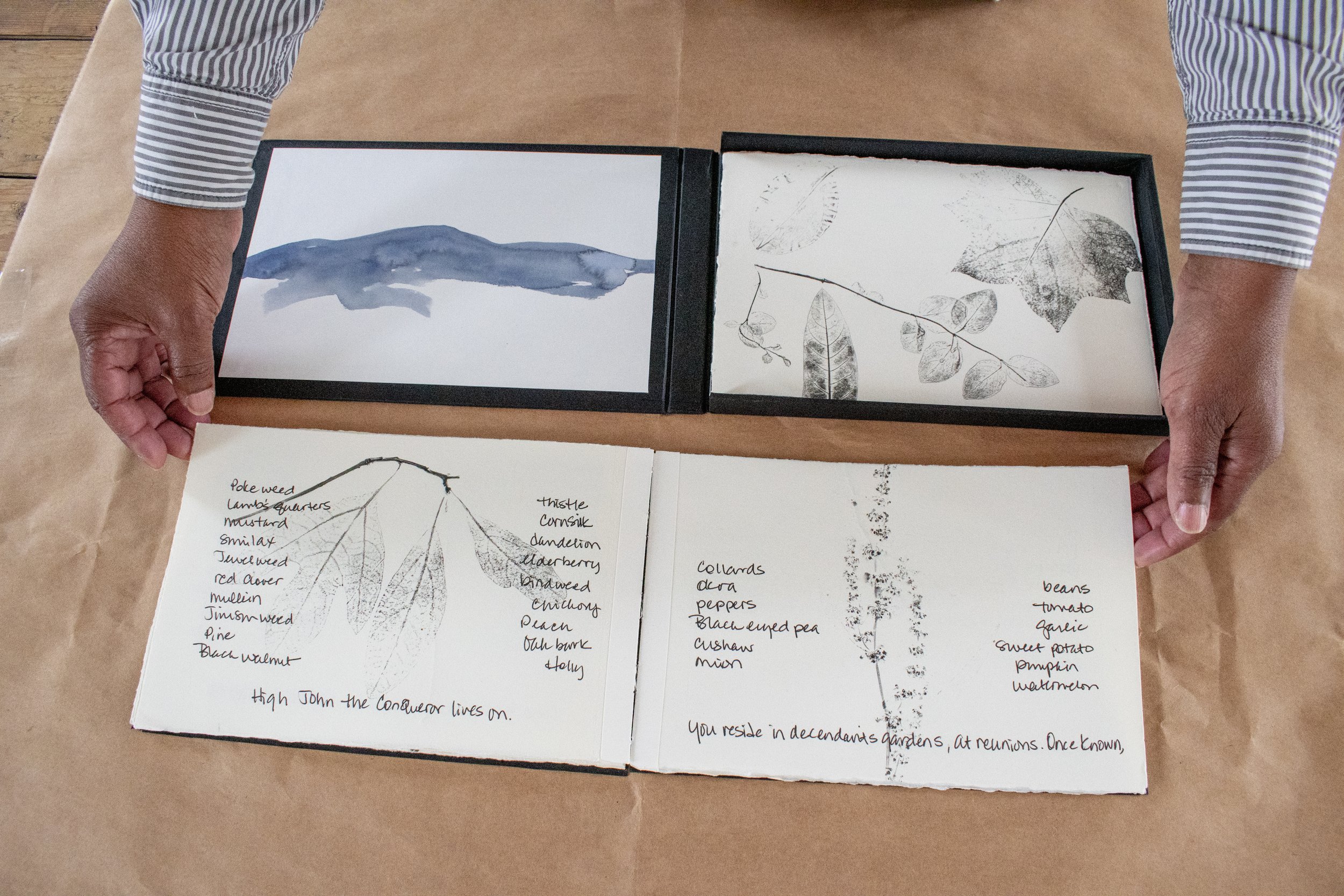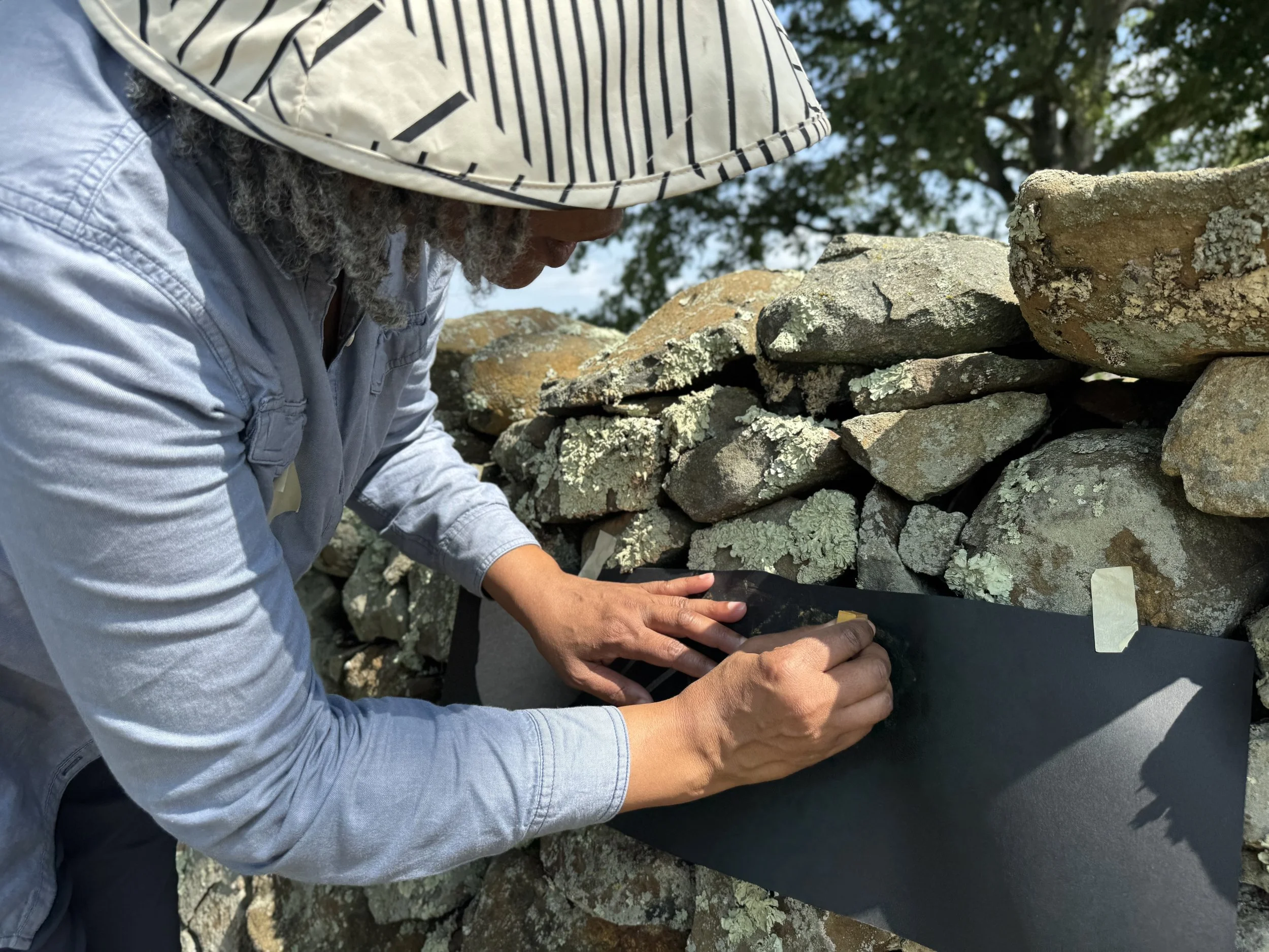 My goal was to complete Tracings onsite - it was important to me that the book should be at, and of, the place. My thought is that it would be made with what was on hand and, though not spontaneous, it would be partially impromptu. Though five weeks was a stretch, it was not such a long time to complete a book (actually two books and a box)! The covers were the last to be completed. I wanted to take rubbings (frottages) of the oldest stone walls, those the enslaved built, which contained spacers of American Chestnut. Thankfully, my other housemate Sefra Alexandra accompanied me on the frottage quest and took the image below.